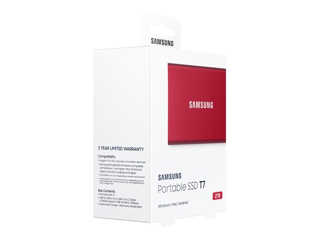 Samsung T7 MU-PC2T0R - SSD - krypterat - 2 TB - extern (portabel) - USB 3.2 Gen 2 (USB-C kontakt) - 256 bitars AES - röd-metallic MU-PC2T0R/WW