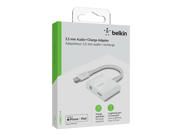 Belkin 3.5 mm Audio + Charge RockStar - Lightning- till hörlursjack/laddningsadapter - Lightning hane till Lightning, 4-poligt minijack hona - vit F8J212BTWHT