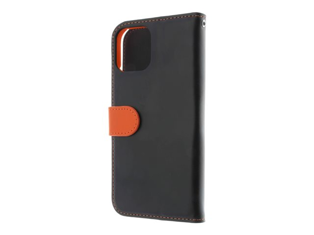 Insmat - Vikbart fodral för mobiltelefon - genuint läder, papper, polykarbonat, kartong, polyuretanklädsel - svart, orange - för Apple iPhone 12, 12 Pro 650-2969