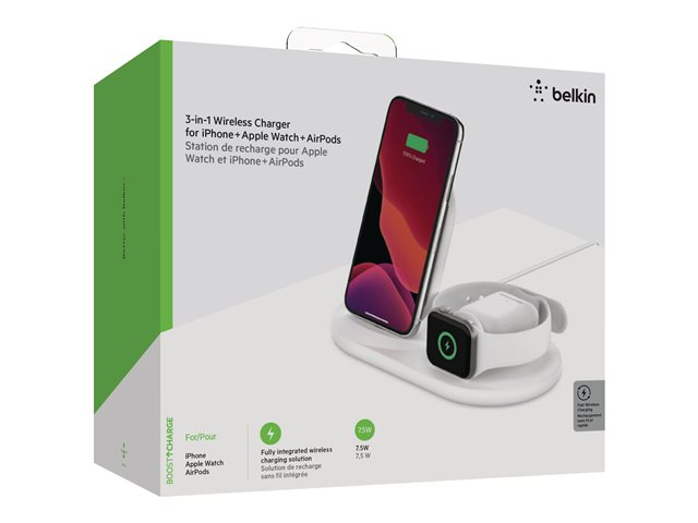 Belkin BoostCharge - Trådlöst laddställ - 7.5 Watt - vit - för Apple AirPods; AirPods Pro; iPhone 11, 12, 7, 8, SE, X, XR, XS, XS Max; Watch