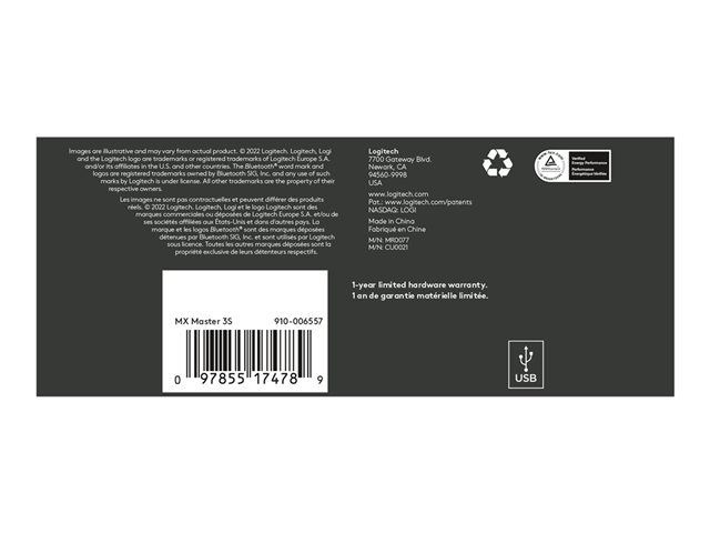 | Egenskaper | Tumhjul, gestfunktion, återuppladdningsbart batteri, Quiet Clicks-teknik, MagSpeed-hjul, anpassningsbar DPI, Logitech Darkfield Laser Tracking, Easy-Switch-teknik, tumstöd |